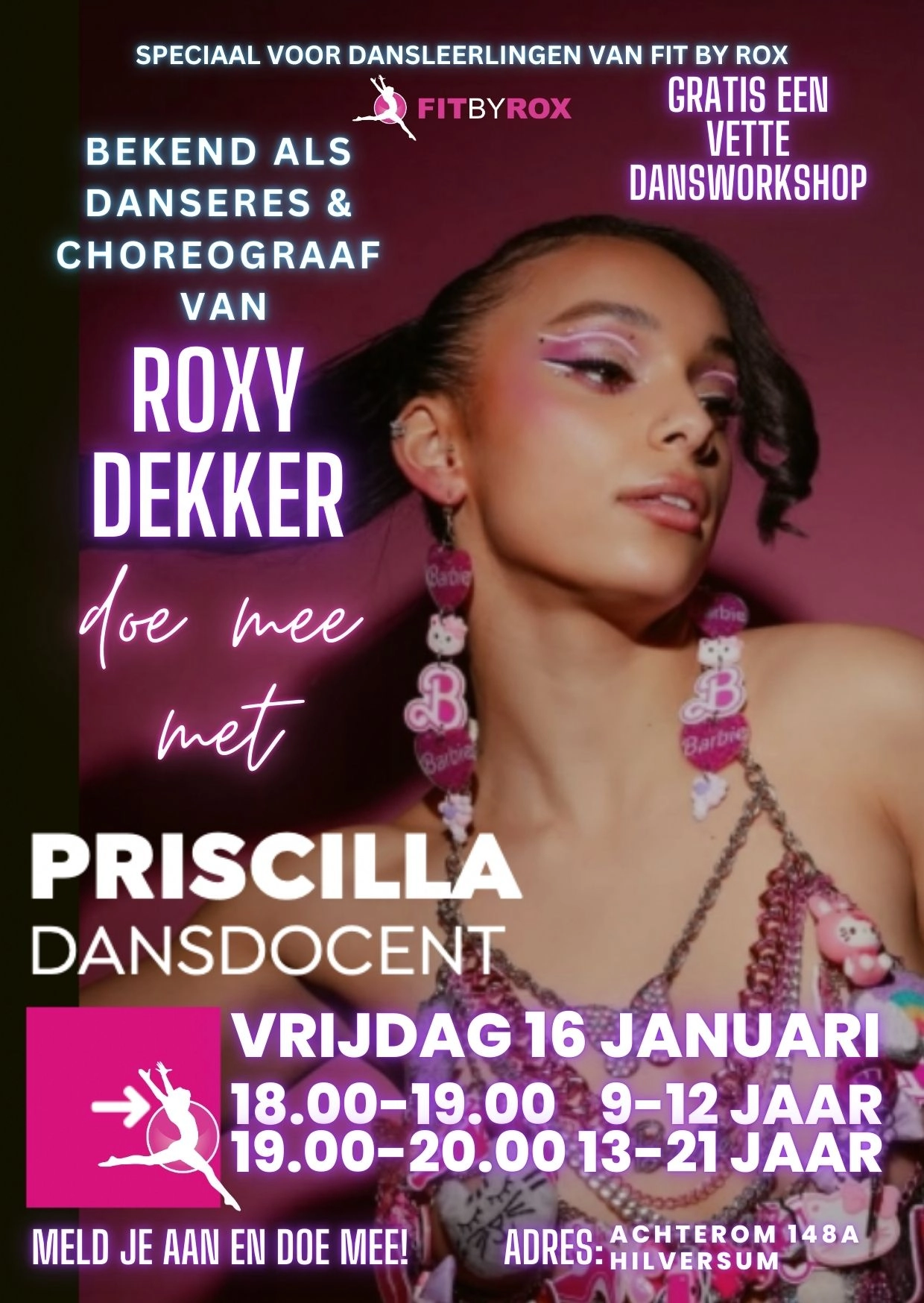 Op vrijdag 16 januari 2026 organiseert dansschool Fit by Rox in Hilversum een gave dansworkshop door dansdocente Priscilla (o.a. danseres van Roxy Dekker en choreografe van Roxy Dekker) voor haar dansleerlingen en introducees.